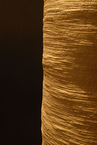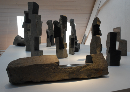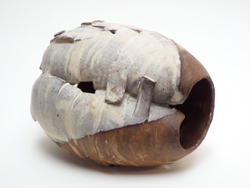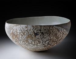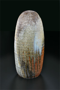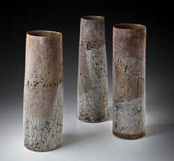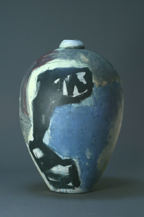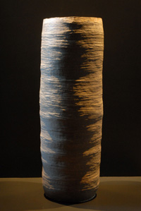 Uwe Löllmann schafft Formen von archaischer Derbheit und elementarer Kraft, die er dann dem tagelangen Brand im Anagama-Ofen preisgibt. Ascheanflug, Flamme und Funkendarben bleiben nach dem Brand auf der Außenhaut der Gefäße lesbar in Farbtönen von grau bis ocker, von dunklem rot bis schwarz. Dann und wann schimmert geheimnisvoll ein blauer Glasurtropfen. In der Anschauung dieser Arbeiten stellt sich Stille in uns ein.