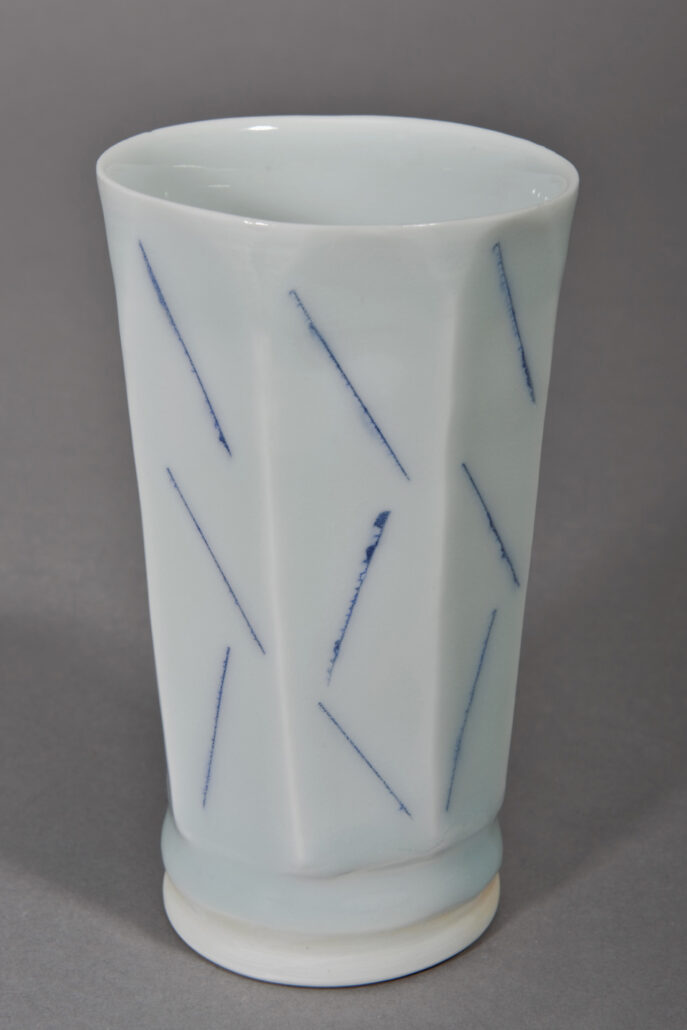 Masamichi Yoshikawa’s colours are linked to memories, he calls the blue drawings in porcelain his diary. The glaze, the seihakuji glaze, reminiscent of a cloudless sky or the colour of a glacier, moves on the object, it melts and floats downwards until the artist cries halt by finishing the firing. They are everywhere but not always visible, sometimes they are even on the bottom of the piece. Through these drawings his works are linked to time. They are vessels that bear stories and traces of the artist.